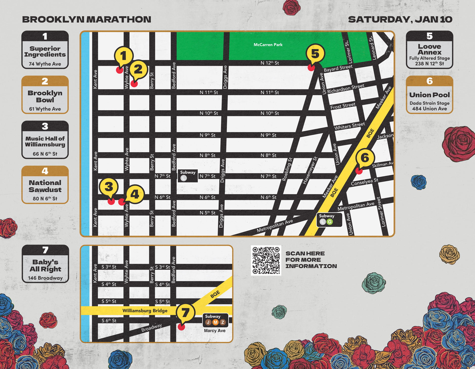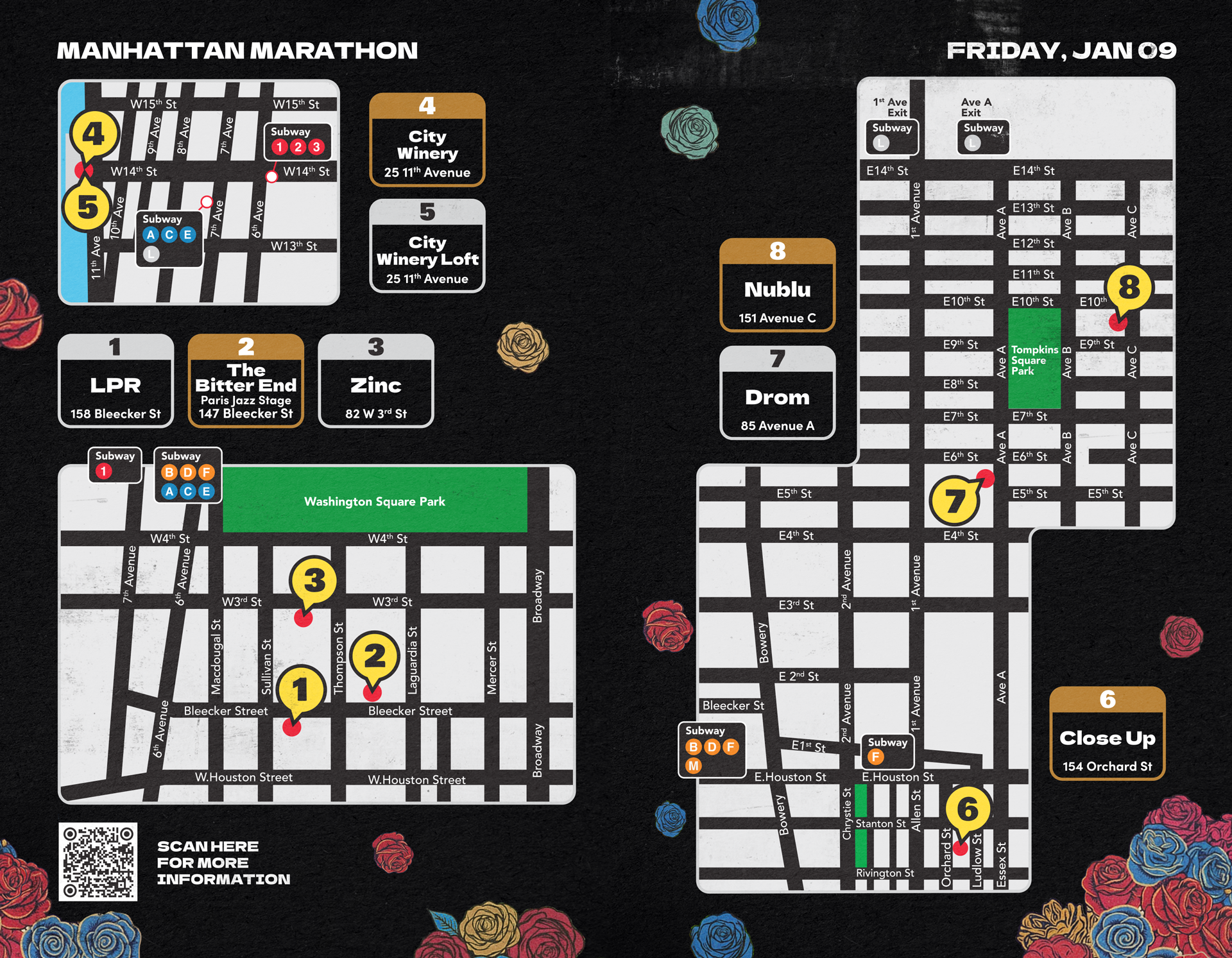 Alongside developing multiple templates and design systems, I was responsible for several key visual assets for the festival: the Manhattan and Brooklyn Marathon schedules (both print and interactive web versions), venue maps, and the collage artworks created for each marathon night. Creating cohesive, high-energy collages from diverse artist imagery was one of the most rewarding parts of the process, and they became some of the most recognizable visuals of this year’s festival.